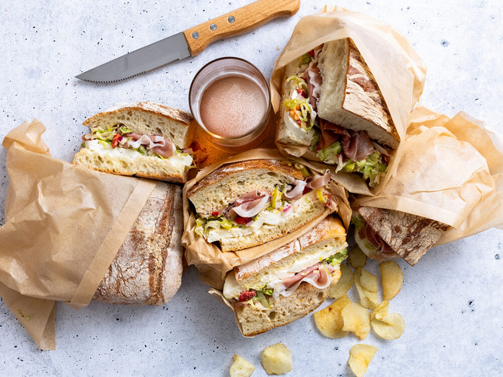 Slice bread in half lengthwise. Spread mayonnaise onto each half (2 tablespoons per sandwich). Layer 6 slices mozzarella cheese onto each loaf of bread. Top each with half the salad mixture. Layer slices of Prosciutto di Parma on top. Serve immediately.